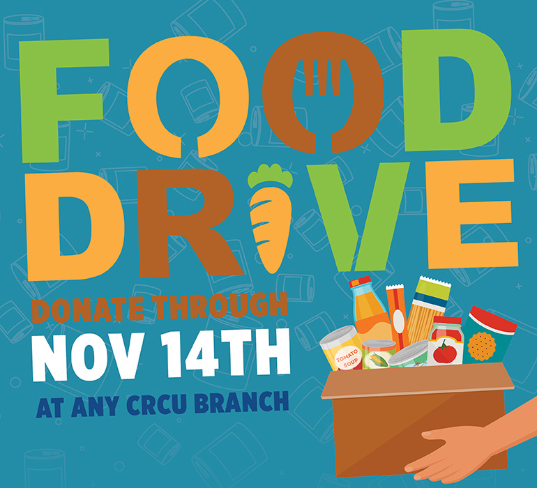 Donate to CRCU's Annual Thanksgiving Food Drive now through November 14th and help local families enjoy a brighter holiday. Drop off non-perishable food items at any CRCU branch in our collection bins. Thank you for helping us make this year's food drive a success!